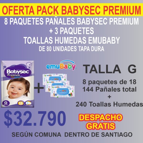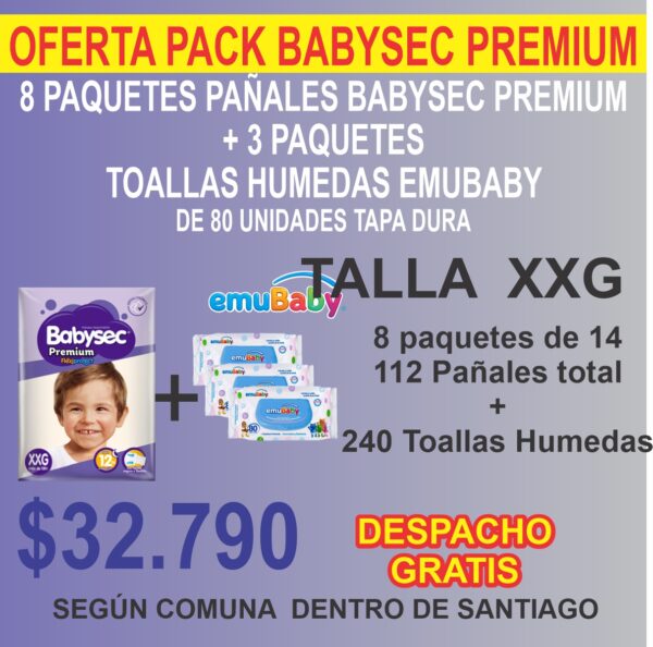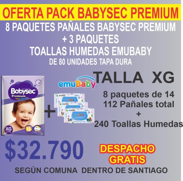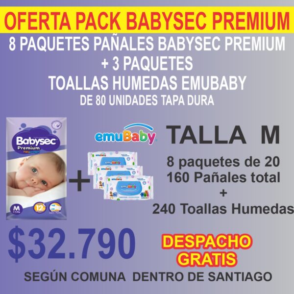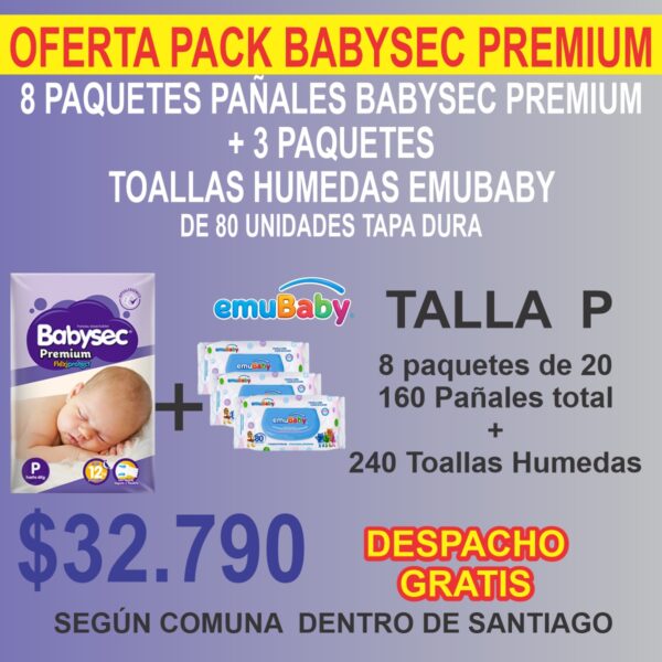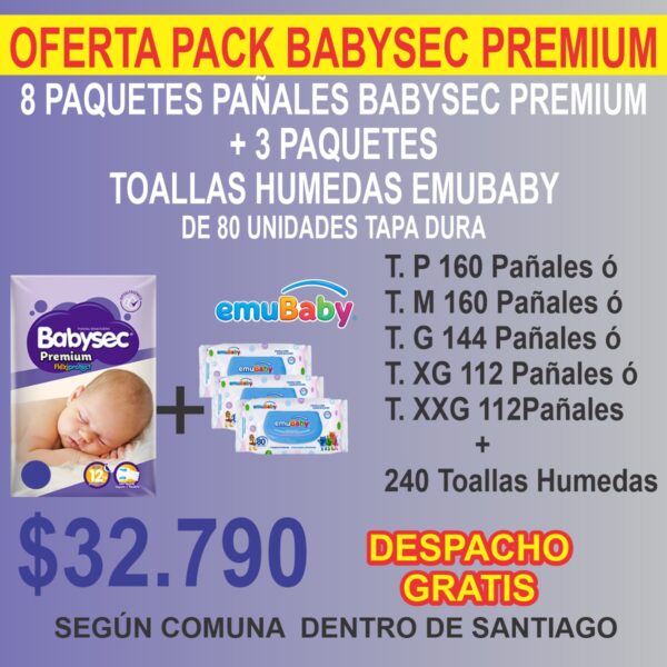 Pack 8 Paquetes Babysec Premium + más 240 Toallas Húmedas Emubaby ( 3 paquetes de 80 unidades tapa duara )