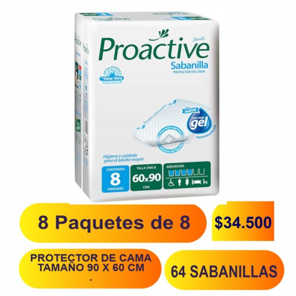 Sabanillas Proactive de 8 unidades de 60×90 cm. Protector de cama con gel súper absorbente y adhesivo de fijación. Hipoalergénicas, con Aloe Vera y PH Neutro.