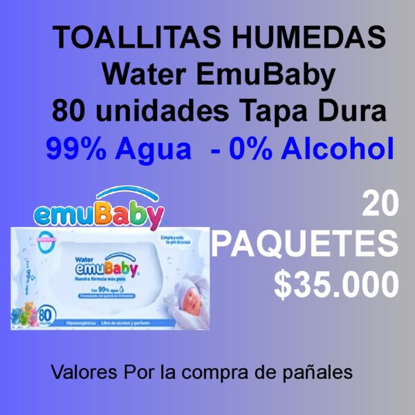 Emubaby Water es la nueva integrante de la familia Emubaby. Formuladas con los más altos estándares de pureza, sin químicos irritantes, sin perfume y sin alcohol. Son ideales para el cuidado y limpieza de la piel de tu bebé desde el momento de nacer, ya que poseen 99% de agua.