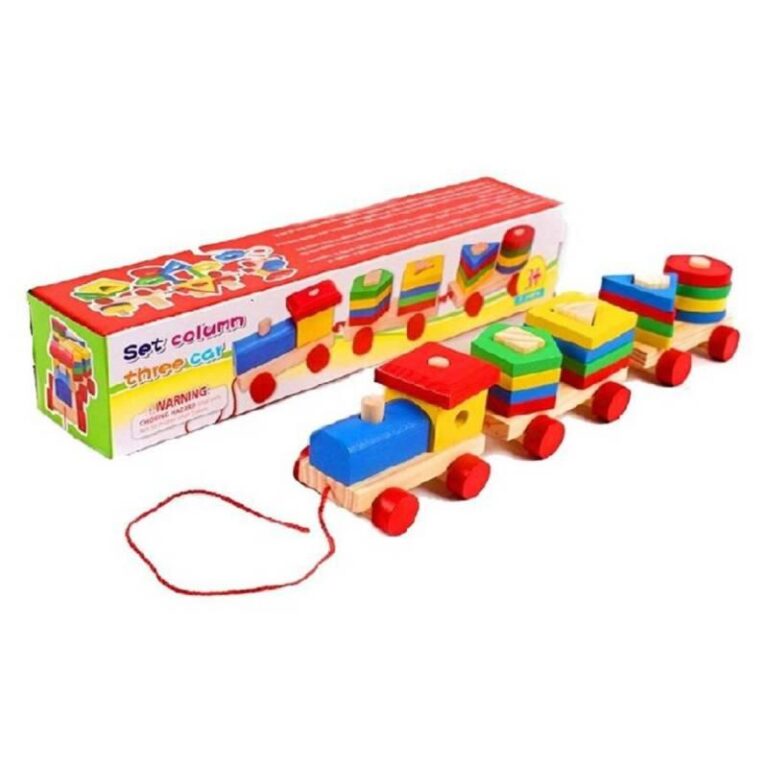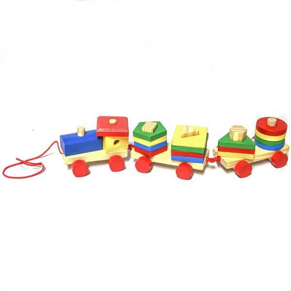 Tren didáctico de madera carga figuras geométricas de diversos colores en forma de encaje.